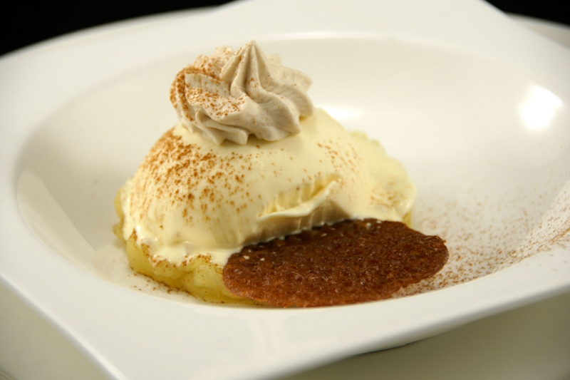 Appelcompote met kaneelijs, kaneelcrème en kaneelkrokantje