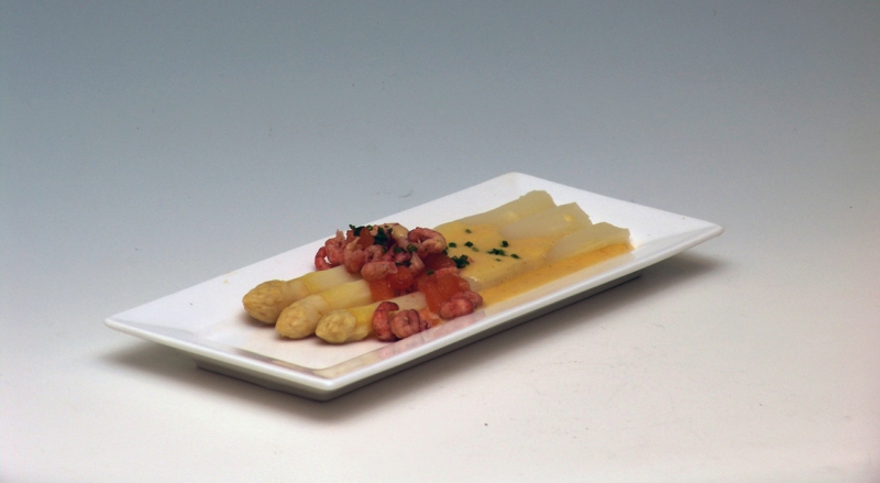 - De saus iets boven het midden van de asperges gieten en daar het garnalenmengsel op aanbrengen.