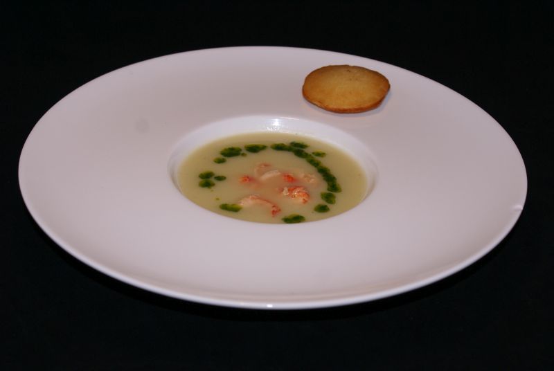 - Schenk de soep in een bolbord en garneer met kreeftenstaartvlees en druppels peterselieolie.