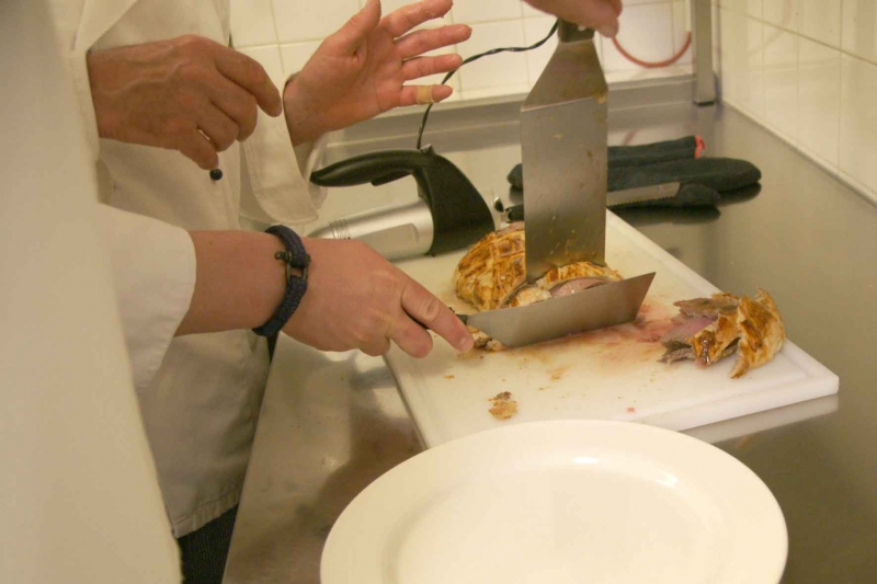 - Steek een digitale thermometer via de zijkant in het vlees, zodat de pin in het midden zit. Laat het vlees in de oven staan tot een kerntemperatuur van 50ºC is bereikt. Haal het vlees uit de oven en laat 5 minuten rusten. Snijd in plakken met behulp van een elektrisch mes en twee deegschrapers (één ter ondersteuning bij het snijden, de andere om het vlees te klemmen).