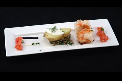 - Maak het bord op met een streepje balsamicostroop, een streepje crème fraîche en de blokjes tomaat.