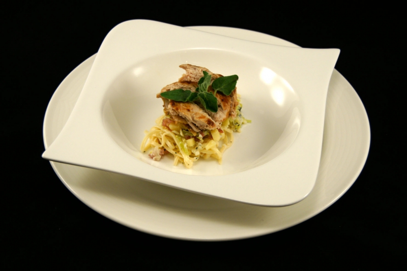- Leg 3 plakjes parelhoenfilets op de pasta.