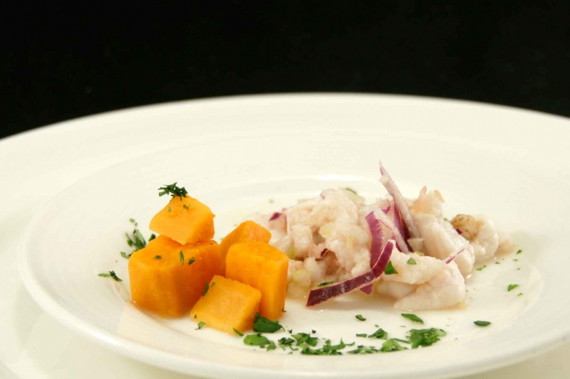 - Schik aan één kant de zoete aardappelen en leg de ceviche aan de andere kant van het bord.