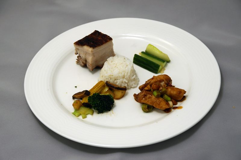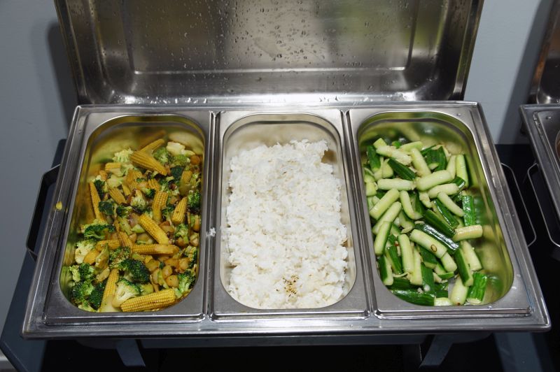 - Vul de 3 smalle bakken met de groentes en de rijst en de 2 grote bakken met het vlees.