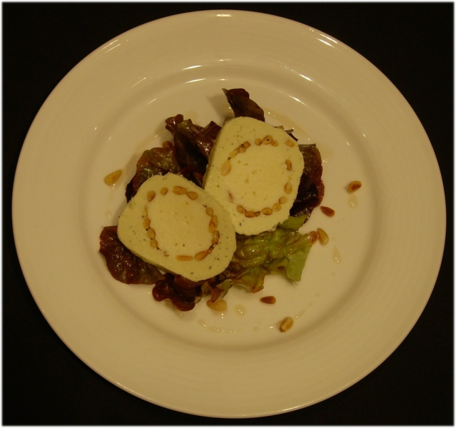- Serveer een plakje op een bordje met eikenbladsla die met wat hazelnootolie, peper, zout en de pijnboompitten is aangemaakt. Giet er wat gembersiroop bij.