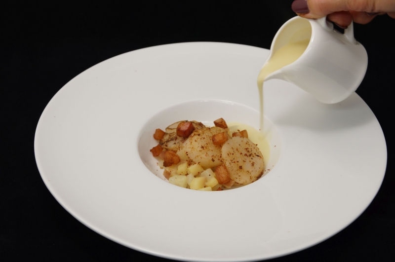 Coquille met een aardappelcrèmesaus, kaantjes en roze peper