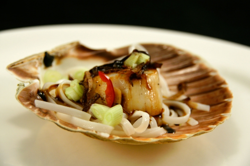- Leg hierop de coquille en garneer met de gesneden lenteui en twee peperreepjes.