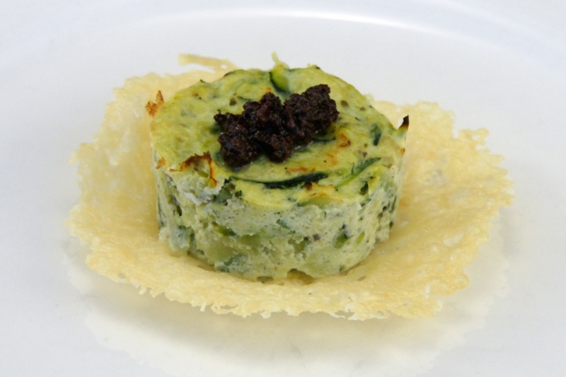 - Leg op ieder bord een tuille en leg daar de lauwwarme courgetteflan op.