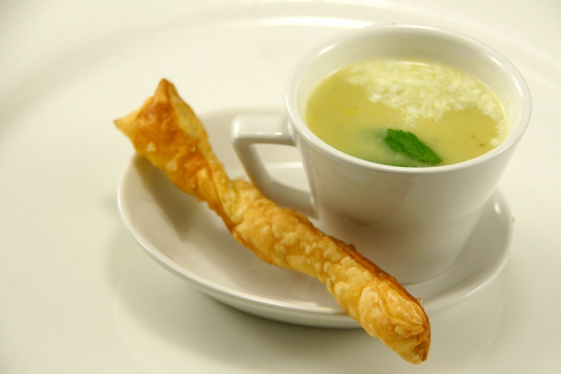 - Courgettesoep.Snijd de lente uitjes en de courgettes in dunne plakjes en doe ze met een scheutje olijfolie, een klontje boter en flink wat peper en zout in een grote pan op matig vuur.