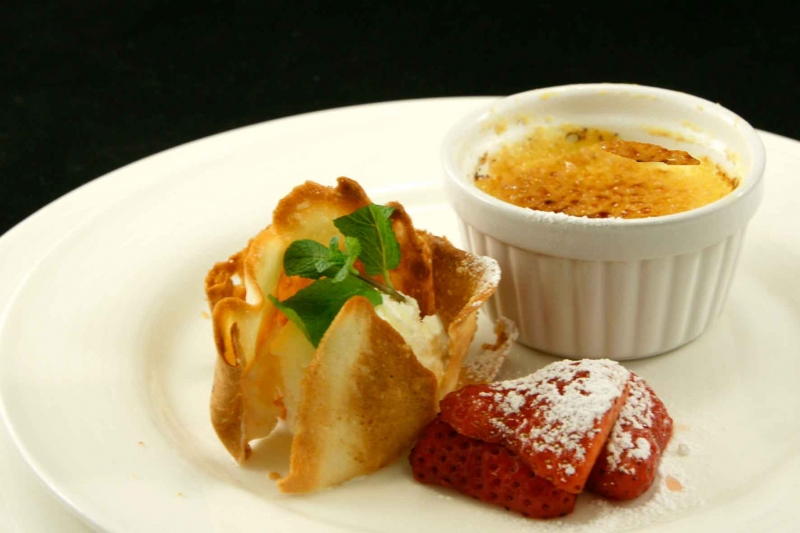 - Zet er een schaaltje crême brulée op het bord en een tuille gevuld met een bolletje yoghurtijs en garneer met een blaadje mint.