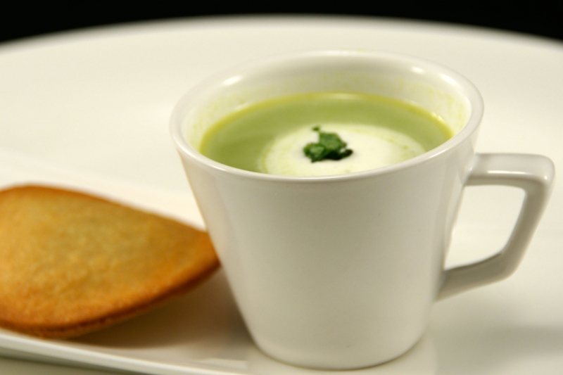 - Vul een voorverwarmd amusekopje met soep en garneer af met de lichtgeklopte room en wat fijngesneden muntblaadjes.