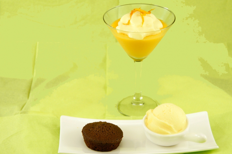 - Spuit vlak voor het opdienen de espuma op de pudding in de ijscoupes. Versier met gekonfijte zestes.