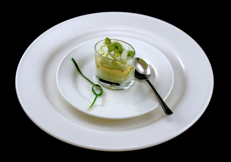 - Maak in ovale glaasjes een laagje aspergemousse, een laagje eiwit, een laagje aspergeroom, een laagje eigeel en nog een laagje aspergeroom.