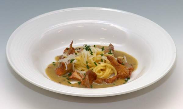 - leg op een diep bord een klein nestje spaghetti. Leg daar om heen wat Cantharellen. Schep de saus er over en rasp wat kaas op de spaghetti. Garneer af met fijn gesneden bieslook