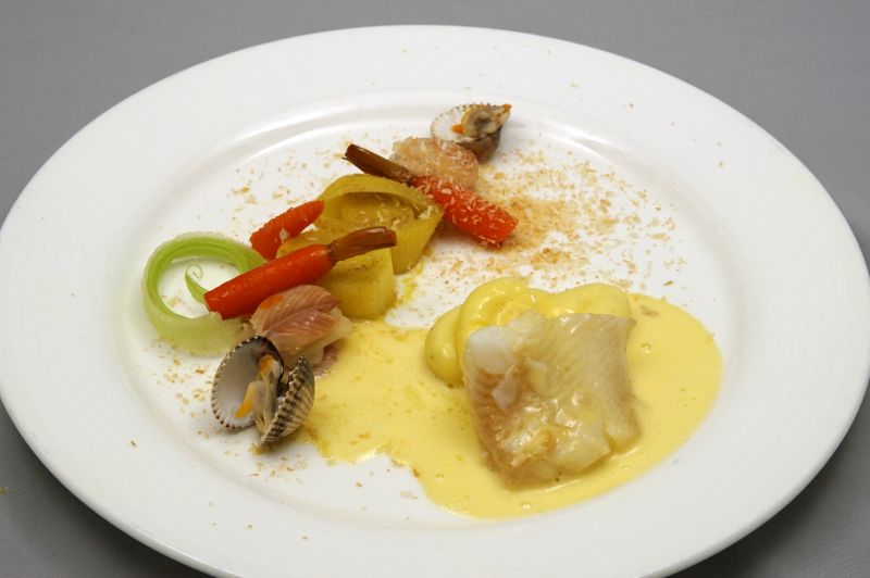 - Maak een creatie van de andere componenten (kokkels, wortel, geconfijte prei, 2 torentjes forel) in een rechte streep ernaast op het bord.