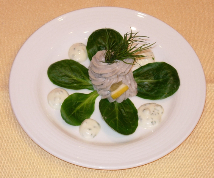 - Leg op elk bord een ster van veldsla en spuit in het midden een rozetje van de paté. Garneer met dille en een klein puntje citroen en een reepje tomaat. Serveer met de bieslooksaus.