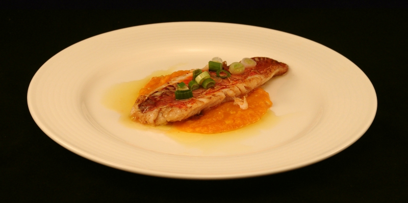 - De rode mulfilets kruiden met peper en zout. De huid voorzichtig iets insnijden, anders gaat de filet krullen.