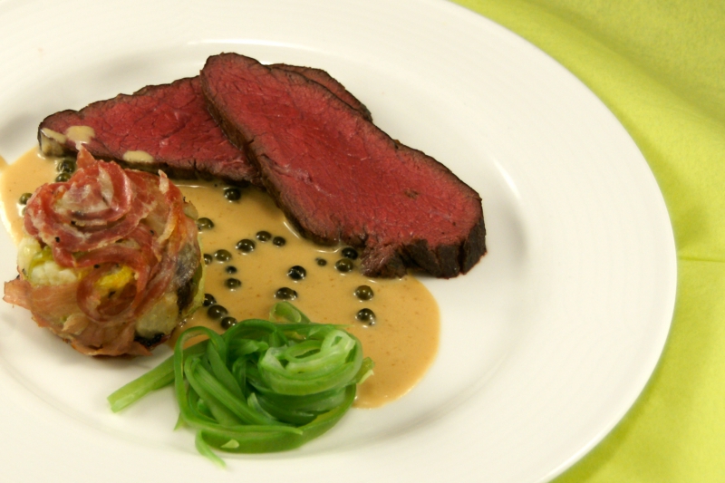 Gebraden rosbief met pepersaus en koepeltje van schorseneren