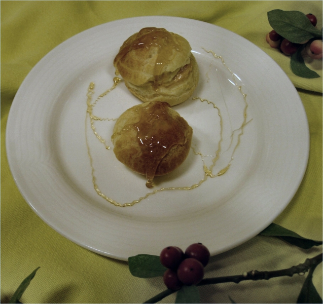 - Kook voor de garnering de suiker met 1 dl. water in tot een lichte karamel. Glaceer de soesjes ermee.