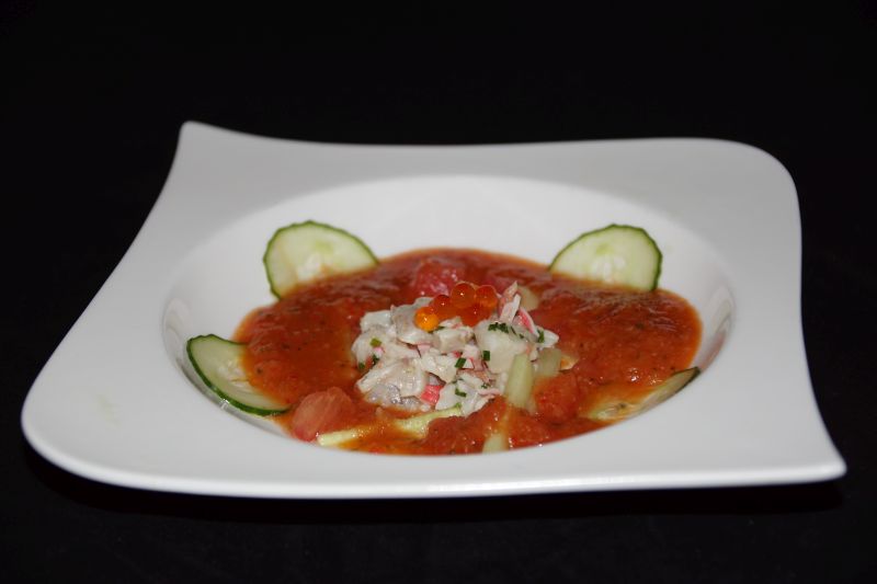 - Strooi daaromheen de blokjes tomaat en de reepjes komkommer.