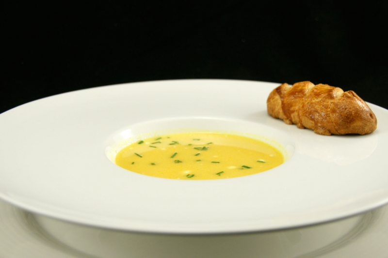 - Schep de soep in soepkopjes en strooi er fijngesneden bieslook over.