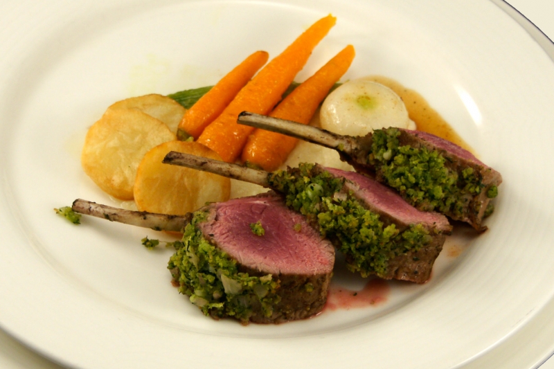 Gepersilleerde lamskroon met botergroente, meirapenpuree, tijmjus en pesto