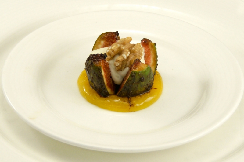 Gevulde en gekaramelliseerde vijg met een zoetzure sinaasappelsaus