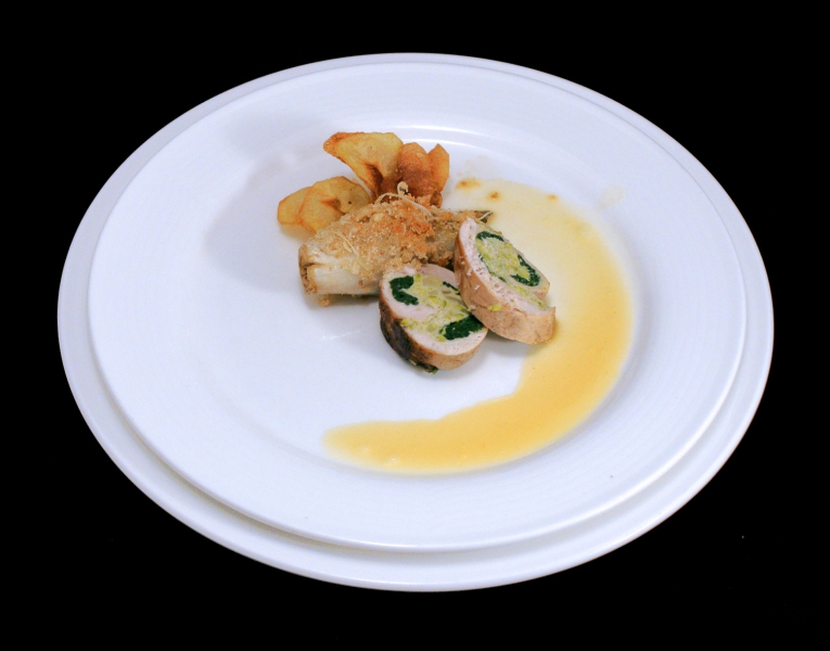 Gevulde parelhoenborst met een sinaasappelsaus en witlof in trappistenbiersaus