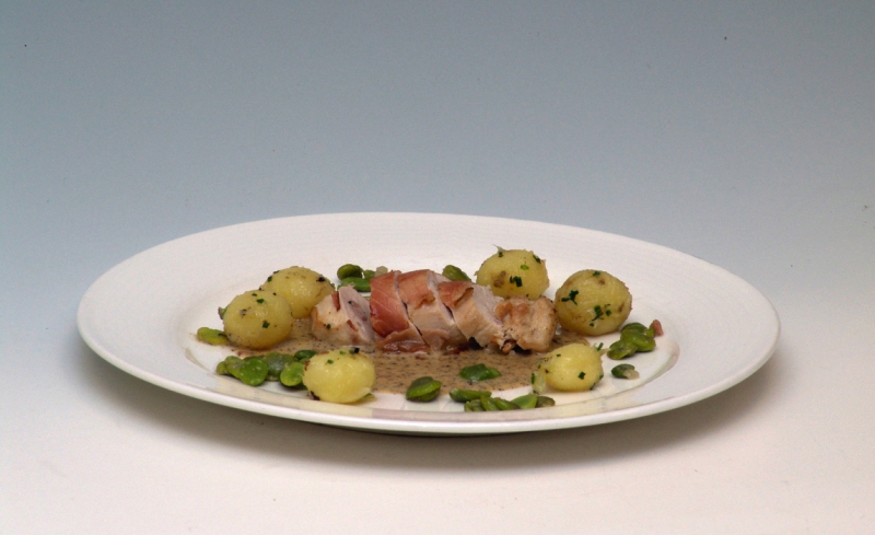 Gevulde scharrelkipfilet met truffelsaus, krieltjes, dubbel gedopte tuinbonen