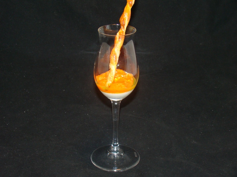 Glaasje met geitenkaasmousse met paprikagelei en bladerdeegstengel