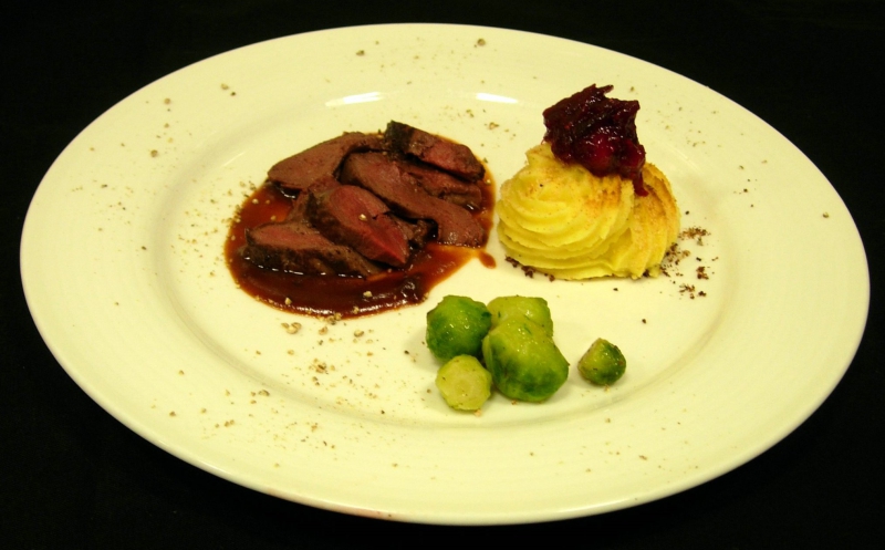 Haasfilet ‘Leonora’ met cranberry’s, aardappelrozetje en spruitjes