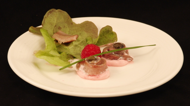 - Leg op het bordje twee toefjes frambozensaus. Leg een mooi stukje eikenblad sla op de rand en daarop een stukje filet. Plaats de rolletjes, 2 stuks in de saus.