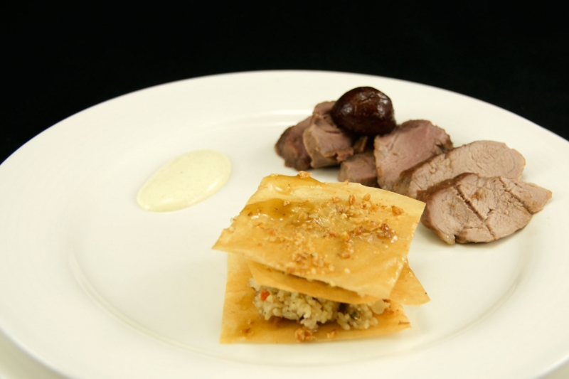 Hartige baklava met paddenstoelencouscous en varkenshaas