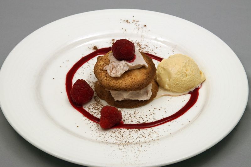 - Schep voor het opdienen op elk dessertbord een kleine lepel frambozenmousse.