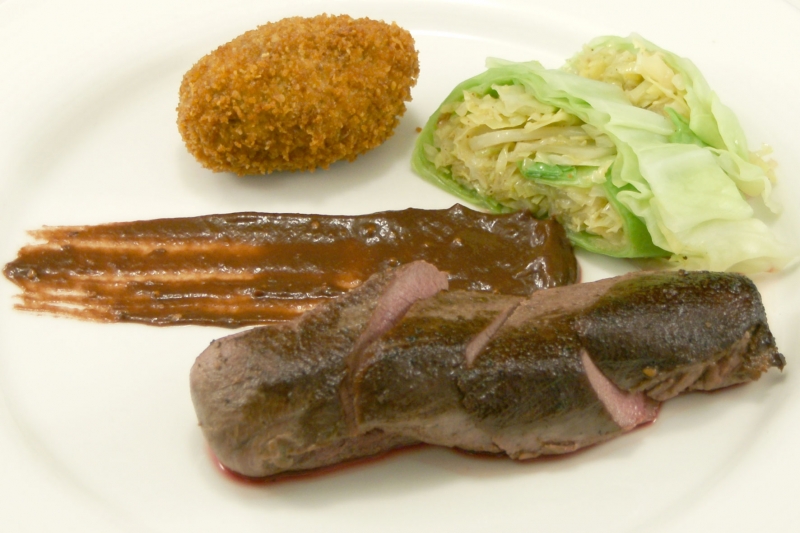 Hazenrugfilet met mosterdsaus, kastanjecroquet, koolrolletje en veenbessencompôte