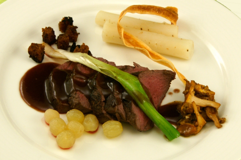 - Schik aan de andere kant van het vlees een rondje uitgelekte witte druiven en wat croutons van peperkoek.