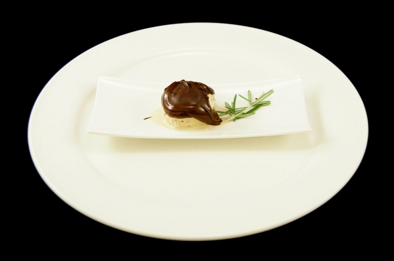 - Smelt de couverture langzaam, doop de ijsbol daarin tot halverwege en zet op een blaadje met folie bekleed, terug in de vriezer tot vlak voor uitgifte.
