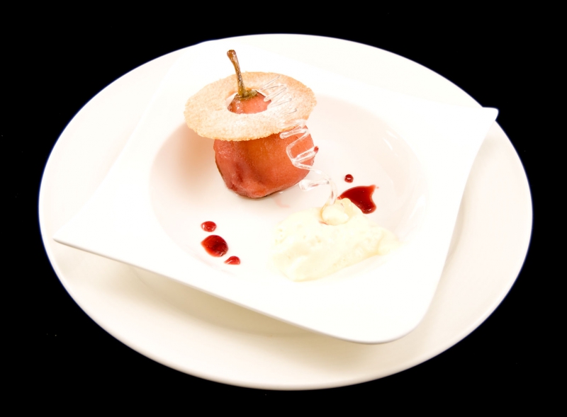 In balsamico gestoofde peren met witte kaneelmousse en krokantjes