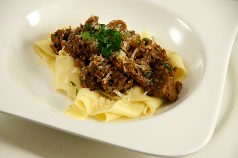- Ragu: Dep het vlees goed droog en snijd de blokken vlees wat kleiner als dat nodig is. Het vlees moet uiteindelijk uiteen kunnen vallen in de ragu.
