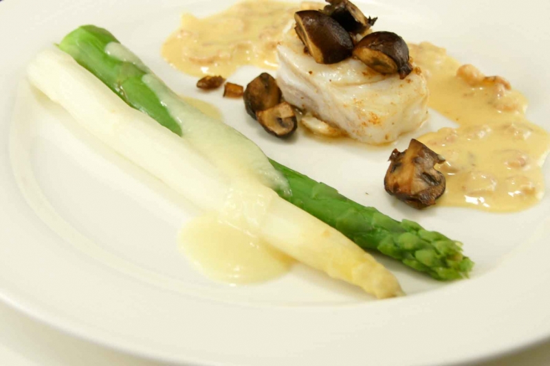 - Serveer de garnalensaus bij de vis en de aspergesaus over de asperges.