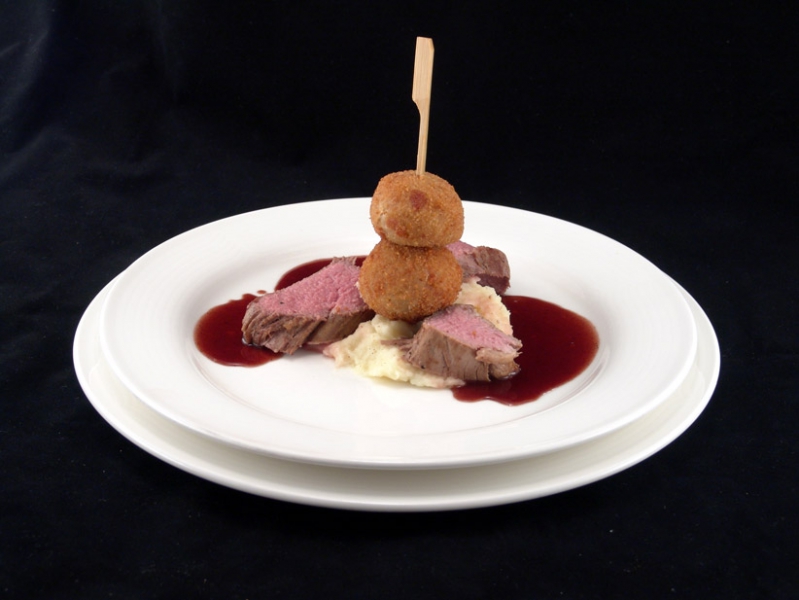Kalfshaas met rode wijn-portsaus, witlofbitterballetje met knolselderijpuree