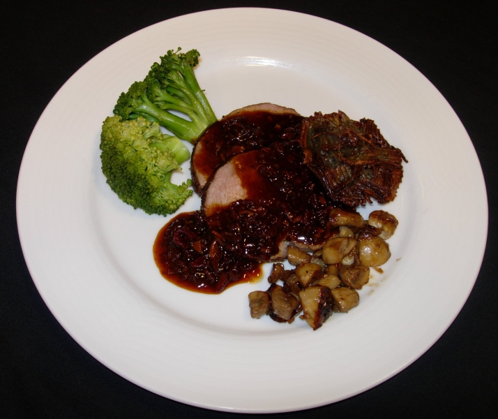 - Leg op elk bord enkele plakjes lende en nappeer het vlees met de saus. Garneer af met champignons, broccoli en een rösti rondje.