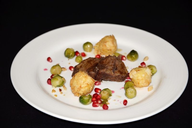 - Verdeel de granaatappelpitjes tussen de spruiten en werk af met de fijngehakte macadamia.