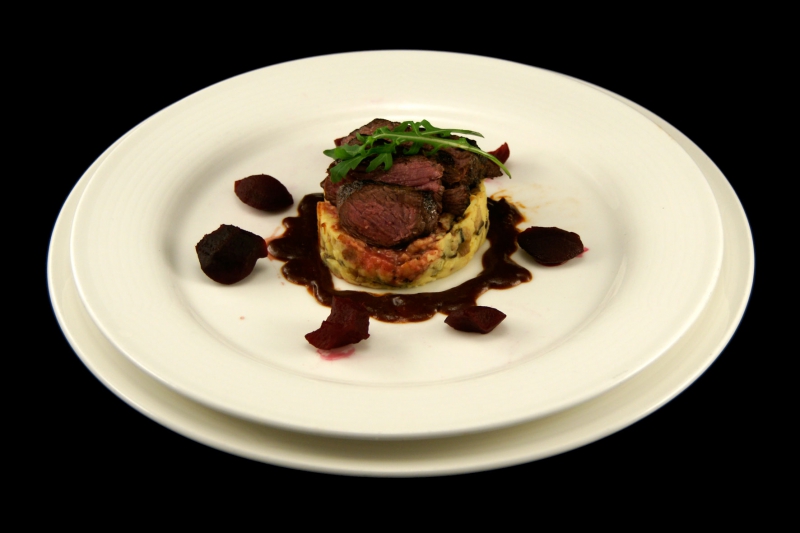 - Leg op de puree een kangoeroebiefstuk, nappeer het geheel met de saus en leg hier de in brunoise gesneden rode biet omheen.
