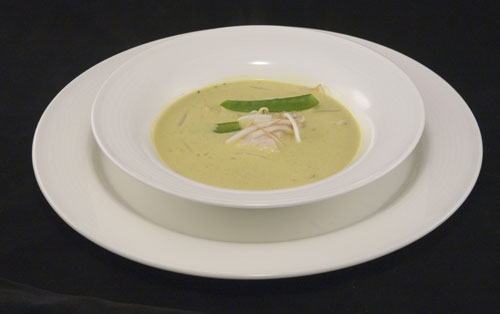 - Leg in het midden van de soep enkele plakjes kip, strooi daar wat taugé omheen en plaats daar bovenop drie peultjes.