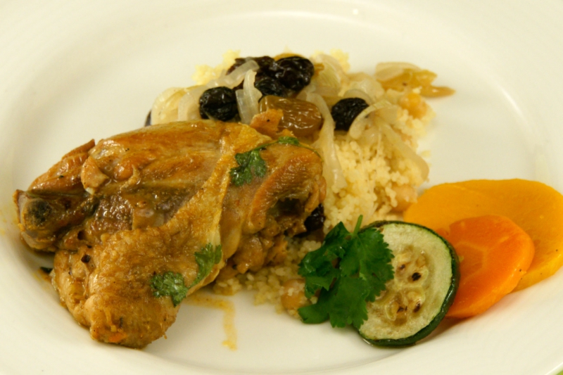 - Schep wat couscous op de verwarmde borden, leg daar wat uiencompote op en een kippendij.