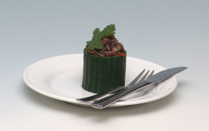 - Snijd de uiteinden van de komkommers en schil ze niet. Snijd 14 dikke plakken van 3cm. Schep met een meloenbolletjeslepel de kern uit elke plak, zodat er bakjes vruchtvlees overblijven.
