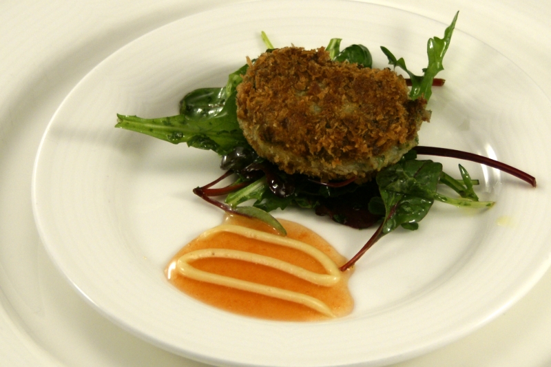 - Voeg de krab en de peterselie toe en breng op smaak met tabasco, worchestershiresaus, peper en een snufje zout. Koel het mengsel in de blastchiller, niet laten bevriezen!