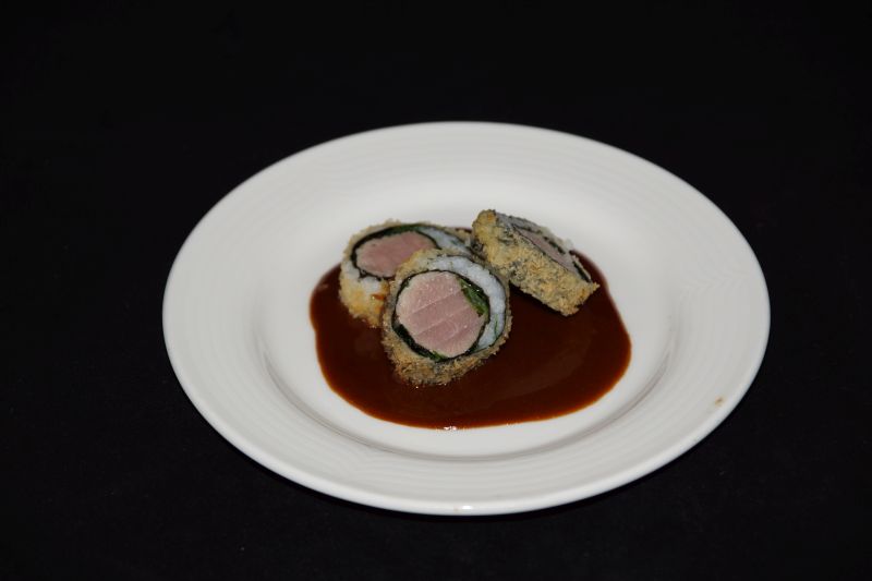 - Leg een spiegeltje van saus op een bordje en leg daar een paar plakjes op van de gefrituurde rol.