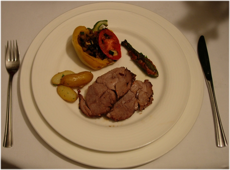 - Degene, die het hoofdgerecht verantwoordelijk is, snijd voor eenieder een stuk van het lamsvlees op een bord. Aardappelen en groenten en saus naar wens zelf nemen.